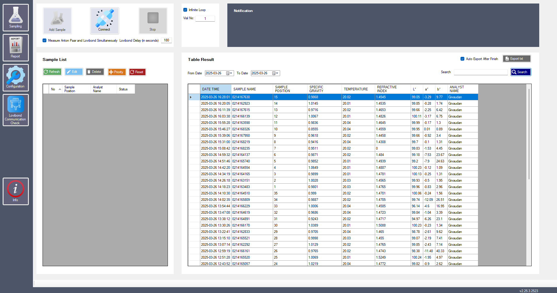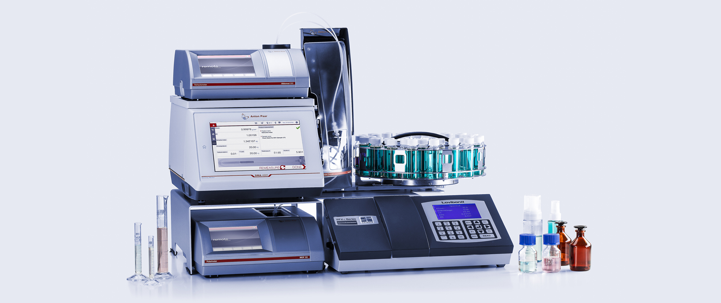 Automation package for sequential analysis of perfume raw materials (density, refractive index, color).