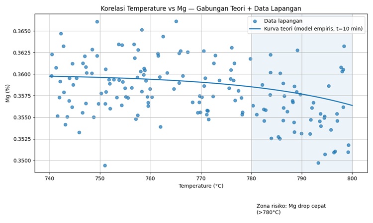 Hubungan yang paling menentukan kualitas metal adalah: Temperatur Melt -> Laju Oksidasi (Mg Drop/Gas Pickup) -> Komposisi Akhir -> Status Heat